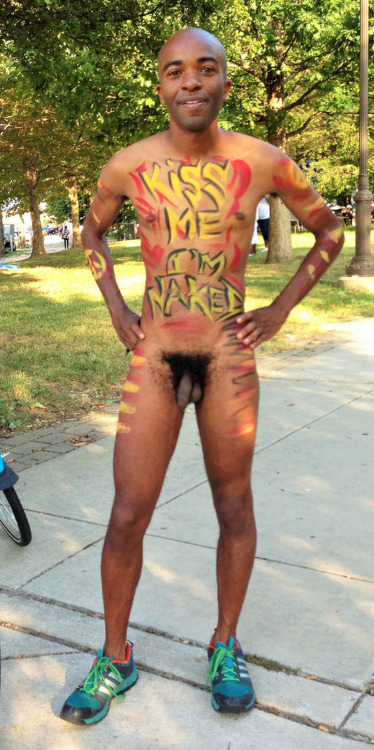Above, his body painted message is plain and the meaning is obvious. All that needs to be done is comply and both will be content and happy! “Kiss Me! I’m Naked!” His service to bring joy into all the world!