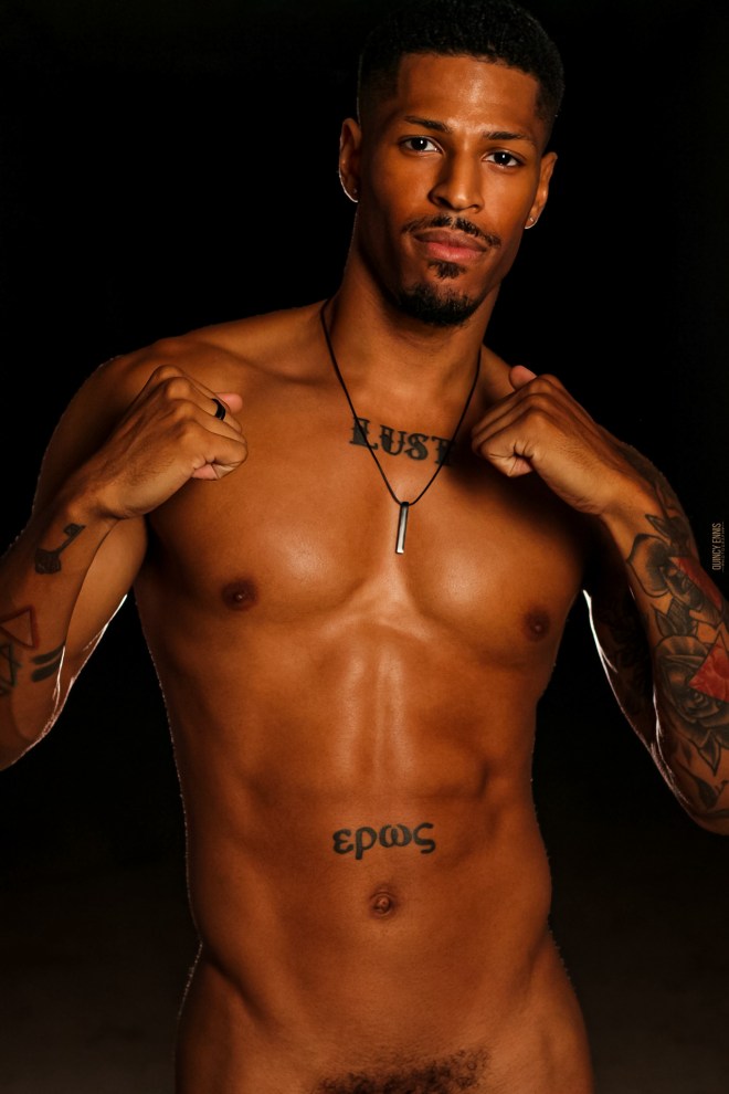 Announcing to all his dedication to his personal as well as professional quest for both his same gender loving (SGL) and his clothes freedom status, openly bisexual Ron Derrick Johnson of the SGL adult film industry boldly has two tattoos inked on the front of his body: lust and eros (Greek: love). For Ron, “lust” is his search for both affection and attention. “Eros” is the name of the ancient Greek god of love and sexual desire.