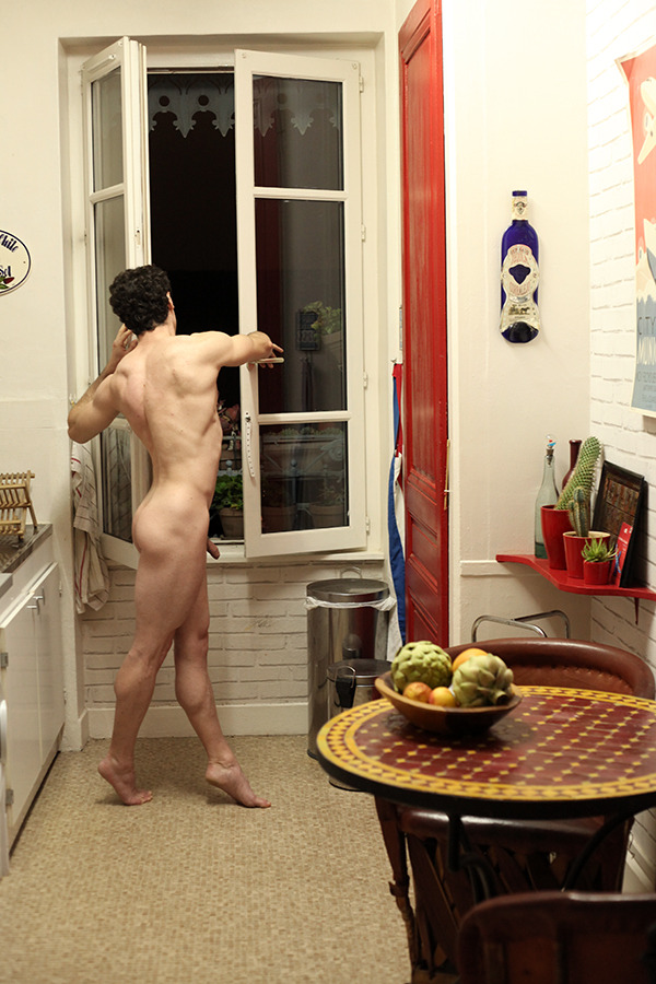 In the attached .gif images, the now retired openly gay adult film industry actor, Francois Sagat, has made his choice, as a bare practitioner, to undertake his fitness routine within the comfort of his nakedness. While doing so, he encounters another man along a stretch of deserted beach who happens to be textile (clothed) – his choice the opposite of Francois.