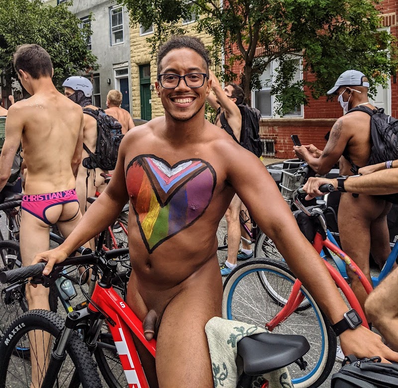 In the above image, a City of London World Naked Bike Ride (WNBR) participant proudly displays his adherence to the WNBR protocol as well as his identity as a bold and confident member of the GLBTQ+ community with his Progress Rainbow flag painted on his chest!