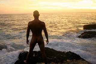 Possibly, as many naturist/nudist critics often equate nudity with exhibitionism, these images captured Aaron’s attention as they were discrete and exposed no gender anatomical features. They absolutely defy the myth that bare practitioners want to shock the rest of the world by exposing themselves in public. This particular model is very certain and proud of his fitness and physique but also respectful of others who may be offended by his display of his genitalia.