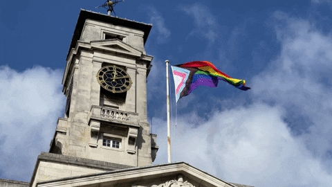 Quasar’s creation placing black and brown stripes (emblems representing peoples of colour) and light blue, pink and white stripes (representing transgender and non-binary persons) in the shape of an arrow on the left of the Progress Pride flag. In Daniel Quasar’s own words “…the arrow points to the right to show forward movement and illustrates that progress towards inclusivity still needs to be made.”