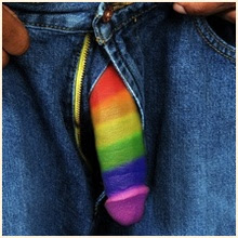 The Commando costume is one SGL bare practitioner who prefers to conceal himself for Halloween in the commando style (absence of any type of underwear) while wearing pants – especially denim jeans! This scary creature then commits himself to exposure by bravely letting himself “hand loose” while freely absorbing the shocked reactions of his “proper” (clothes wearing) victims! Our Commando-Freak above has body-painted his penis in the rainbow colours of the GLBTQ+ movement!