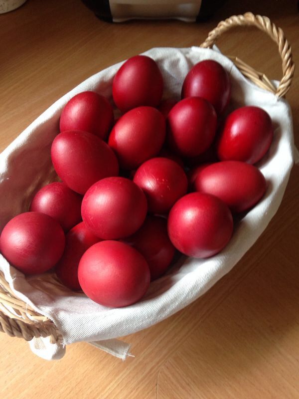 In the early hours of Easter morning, following the conclusion of the Resurrection Liturgy, the faithful exit the ecclesiastical sanctuary of the churches and encounter baskets and trays of traditional dyed Easter eggs ready to be consumed. The festive spirit of the holy day continues with all participating in the classical custom of greetings.